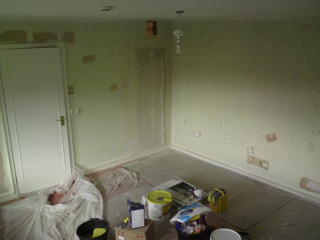 - One of the bedrooms. Mostly we were filling and sanding, prepping for paint. But this one had a layer of paint on before I left…