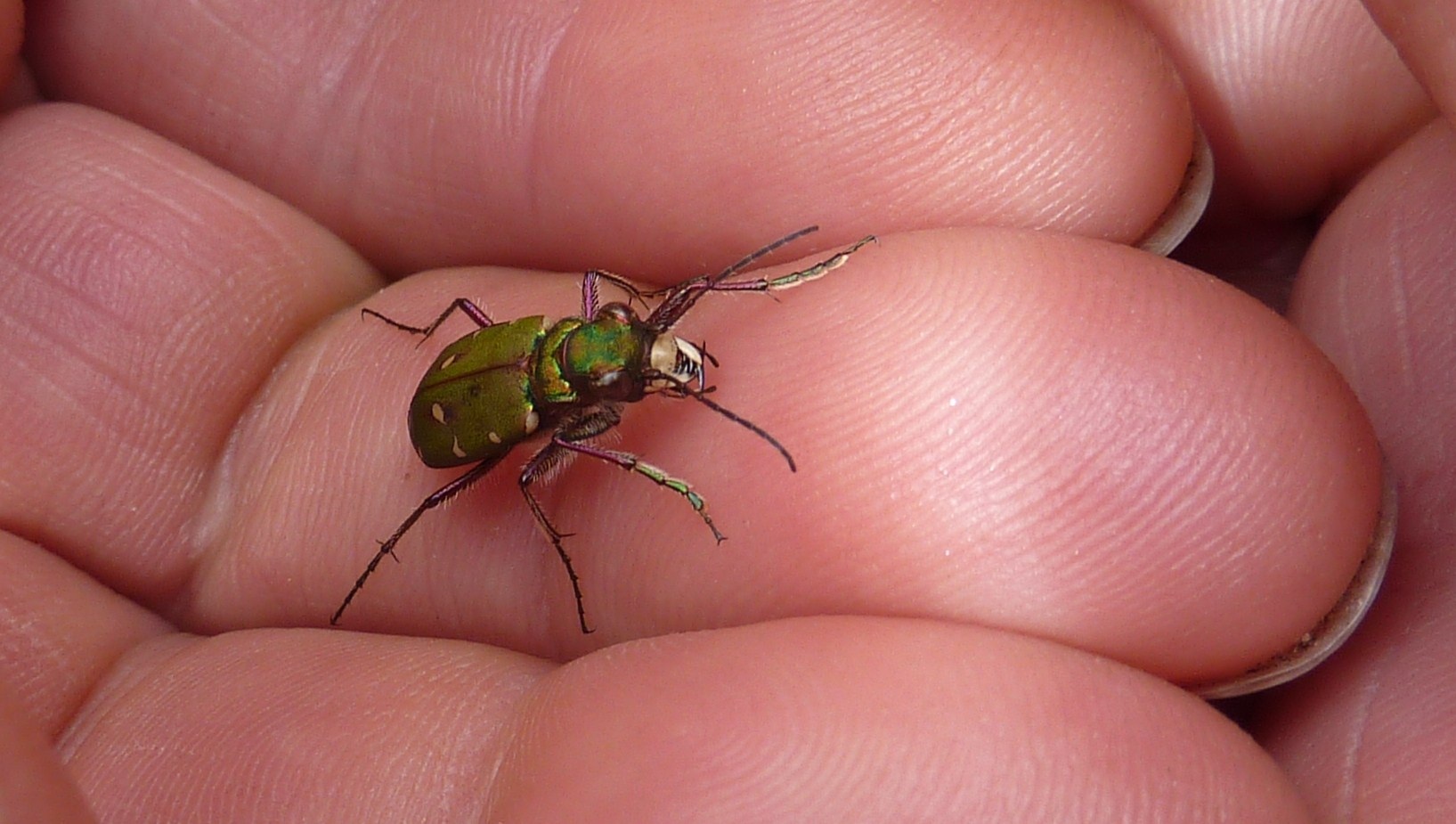 - A Green Tiger Beetle. And a hand.