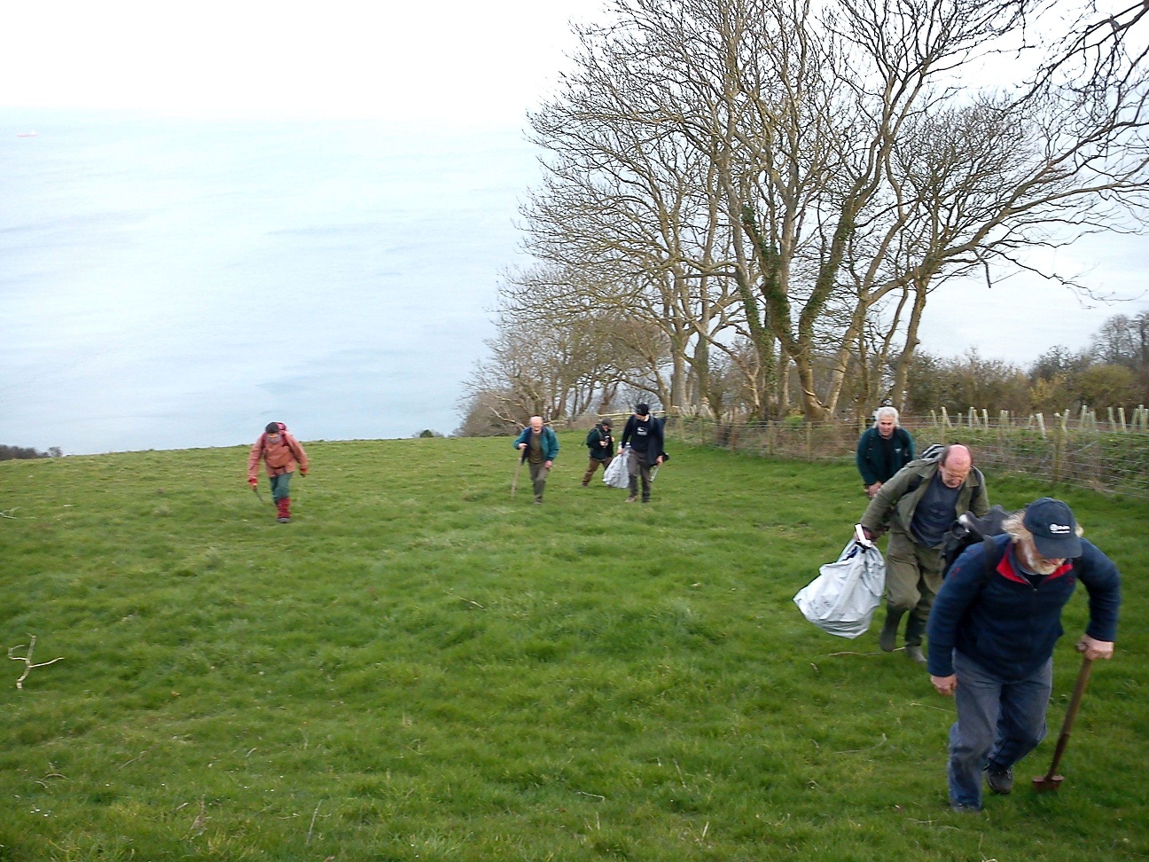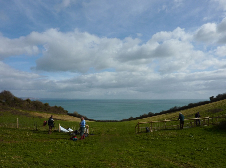 Today, with some of the Wednesday vols, we planted a hedge at the RSPB reserve at Labrador bay. The weather was again delightfully bright and sunny. Despite the extraordinarily steep slopes no one fell off the hill into the sea.