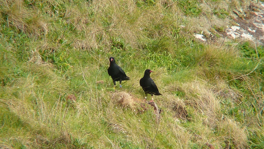 Day 2, and I’m shown another pair, who are apparently young but enthusiastic, and then an assortment of other choughs, including a couple of males who seem to be quite close. So close in fact, that they seem to be ignoring the attention seeking actions of a local female. They become known as the ‘boys’. They like flying along cliffs in formation, especially with ravens and occasionally kestrels.