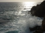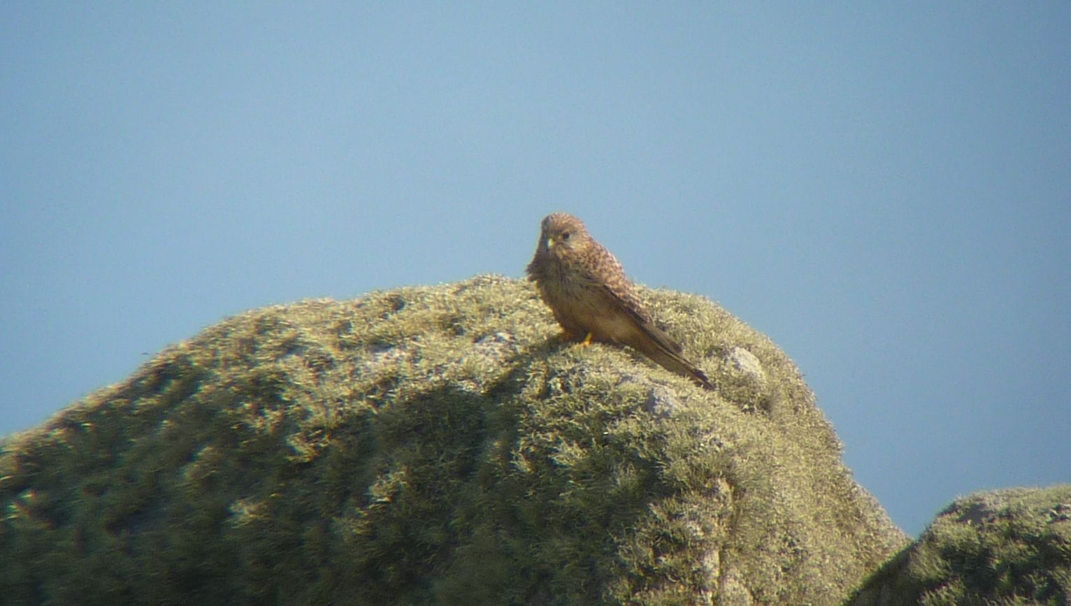 However, Brownblue isn’t getting things all his own way. Yesterday I’d spotted a Peregrine about on rocks a couple of times, which the choughs are usually wary of. Seemingly with good reason, for as they both flew away from the nest site yesterday afternoon, he suddenly twisted and dived, dropping amazingly quickly down towards the sea. As he went below the cliff line I just managed to catch a glimpse of something dropping after him. Although I didn’t manage to identify it at the time, I can only assume that it was the Peregrine, as I know nothing else likely to do this. Anyway, I stood there wondering if it was possible that he might have been caught, or even if he, or his assailant, had not pulled out of their dive before hitting rocks or the sea (they were already flying quite low). Thankfully I spotted Brownblue on some rocks a few hundred metres down the coast. He then flew slowly back to meet up with our lady, who had taken refuge on rocks up the slope from me. They spent some time reassuring each other, and tapping beaks, and I wondered what he must be thinking as they flew off together.
