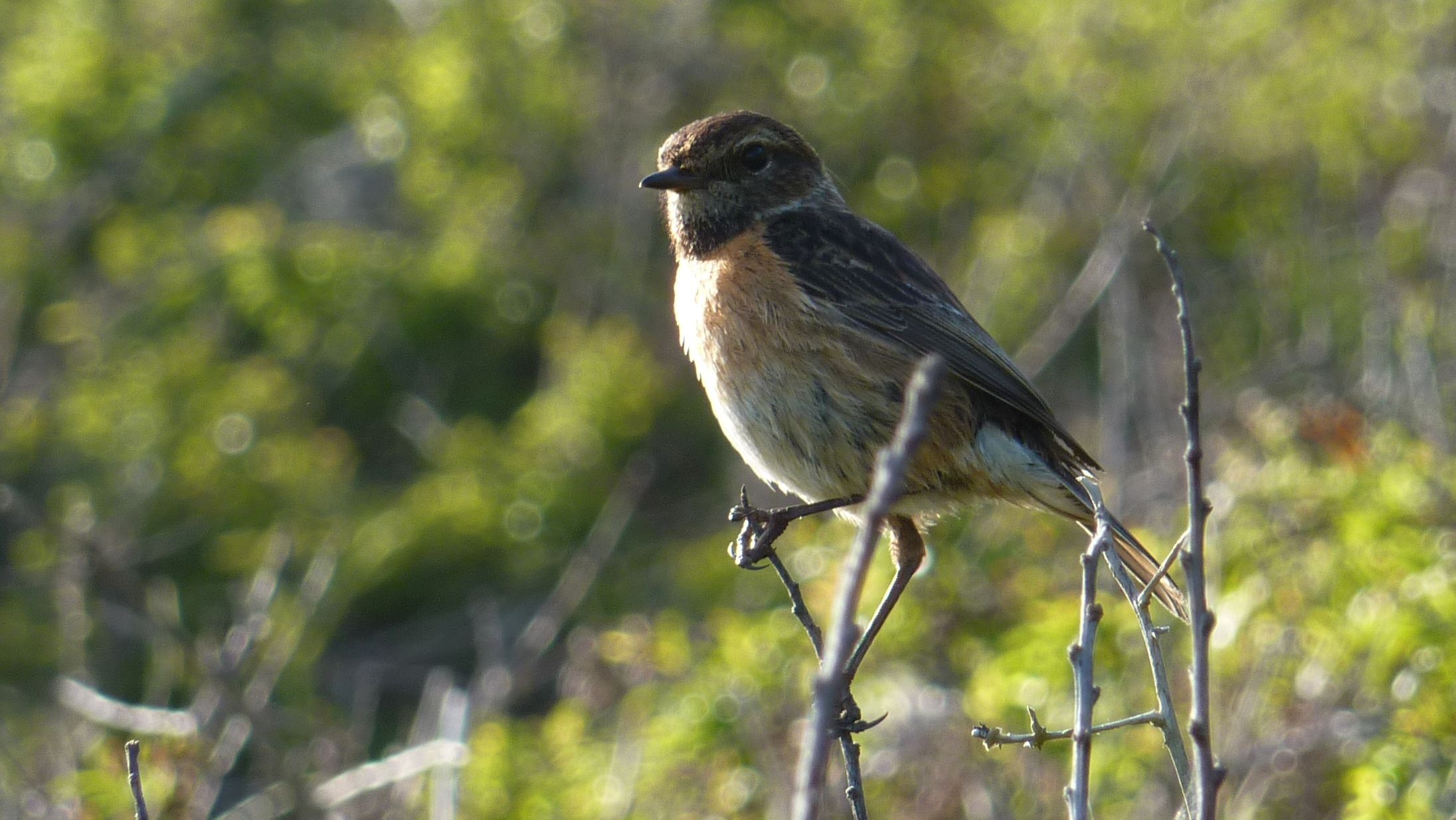 Ha, Saxicola rubicola. Such a quality name. Saxicola means rock dweller, and rubicola means to drink red fizzy pop. These birds are also known as stonechats, because they often make a call exactly like the sound of two small stones being knocked together. On the coast they hang about in the scrub, eating insects; further in land they like heathland and small scrub. Whilst walking this evening I was lucky enough to see male and female feeding a juvenile. I’m afraid I only managed a decent shot of Mrs Rubicola, but I think it’s one of the most exciting photos I’ve ever taken.
