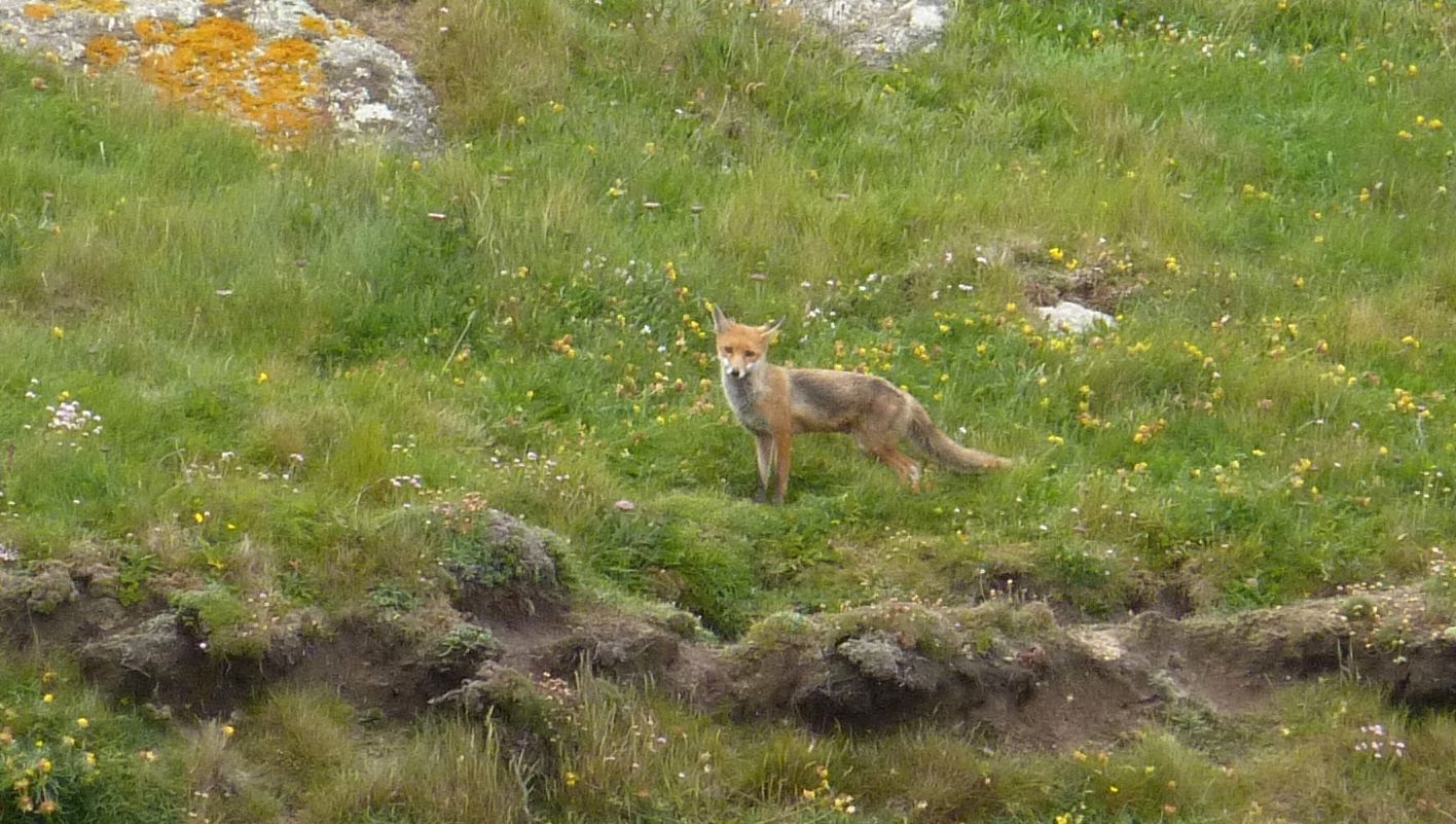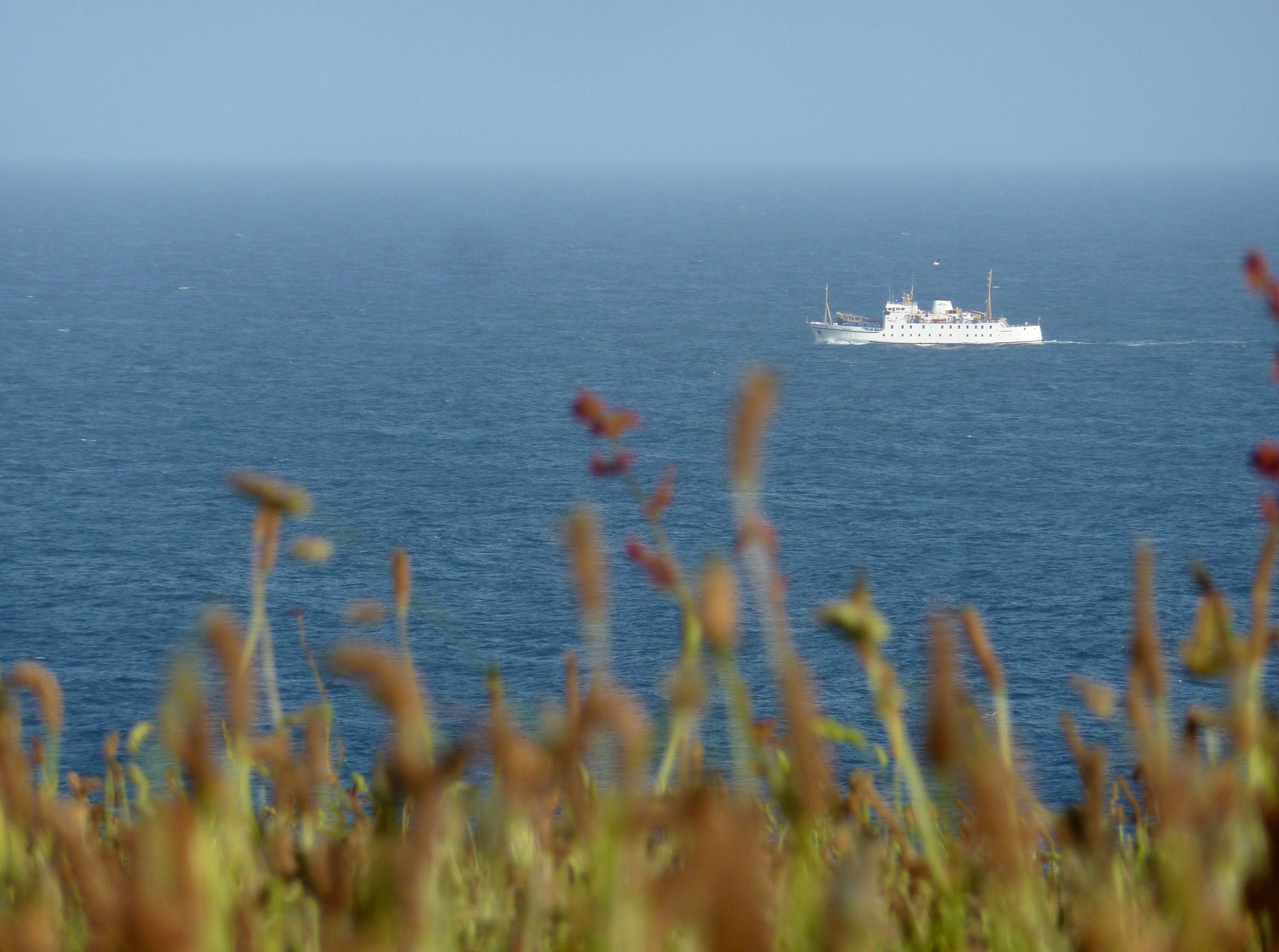 I haven’t seen much rain while I’ve been down here in Cornwall and, apparently, most of the South West is pretty dry. When I left my camper this morning (after a day off) it looked bleak though. The mist and rain persisted until after midday (although I’ve seen worse), and then it cleared into another beautiful, bright day. The choughs were good, I saw a fox again, and watched a seal up close for a while. My walk home was through wild flower meadows, with deep blue sea and skies, and the Scillonian slipping past on its way back to Penzance.