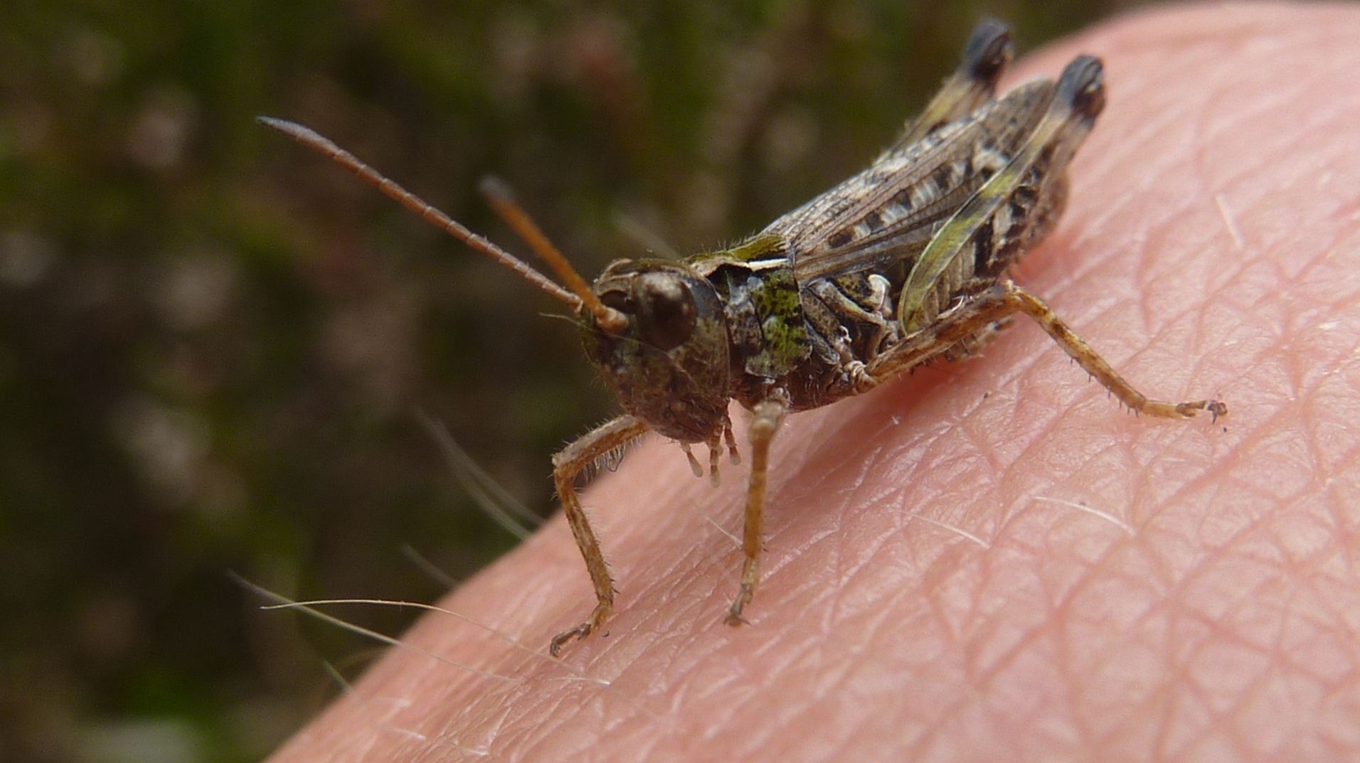 - This is a mottled grasshopper (Myrmeleotettix maculatus). I can tell by the thickening tips and unicolourous nature of the antenna.